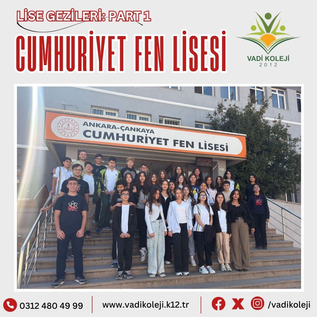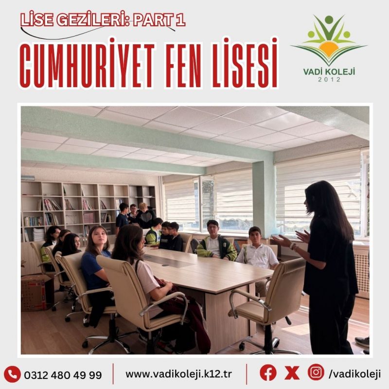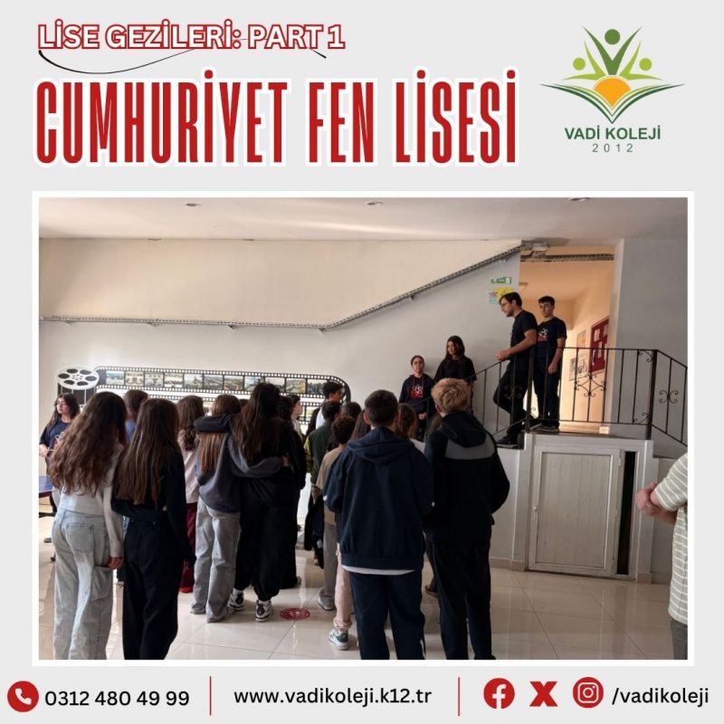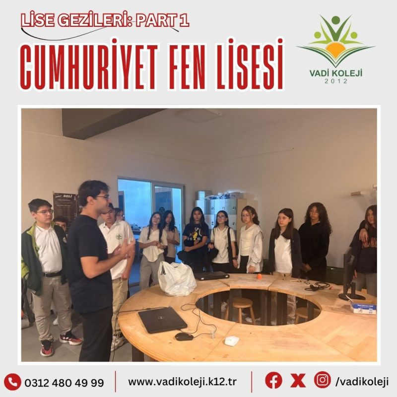 Uncategorized LİSE GEZİLERİ: CUMHURİYET FEN Ekim 10, 2025 Posted by vadi 10 Eki 8.Sınıf öğrencilerimizin lise gezileri kapsamında ilk durağı Cumhuriyet Fen Lisesi oldu.