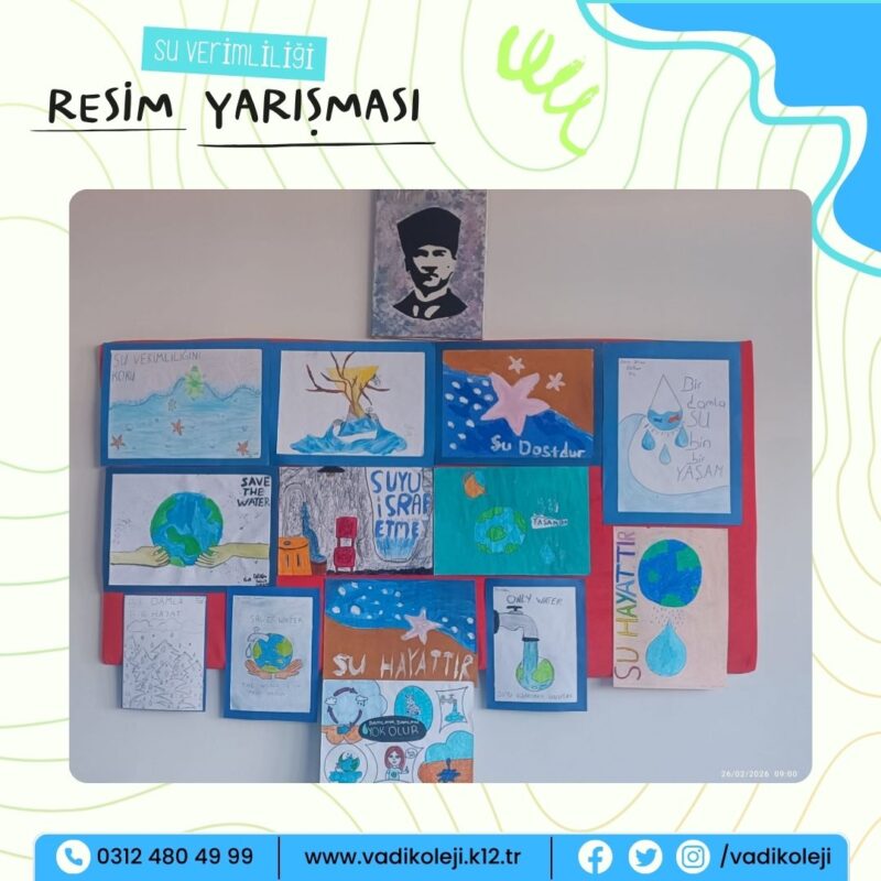 Su verimliliği projesi kapsamında ortaokul öğrencilerimiz bakanlık tarafından organize edilen Su Verimliliği Resim Yarışması’na katılım gösterdiler. Su israfı ve suyun önemini vurgulayan eserler okulumuzda sergilenmekte.