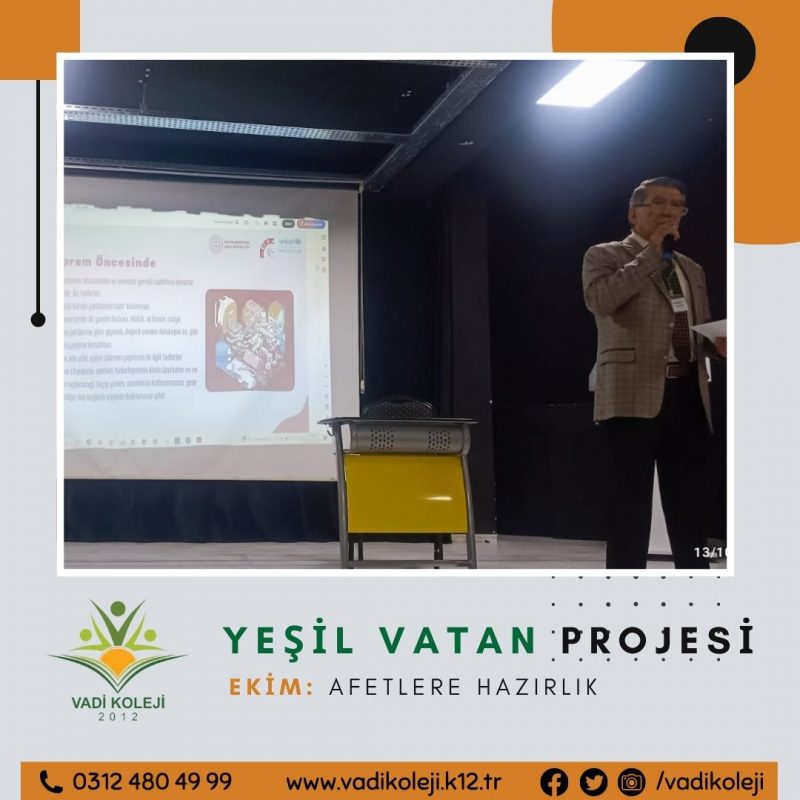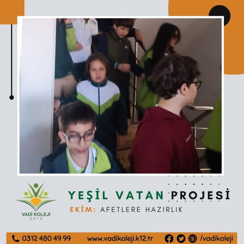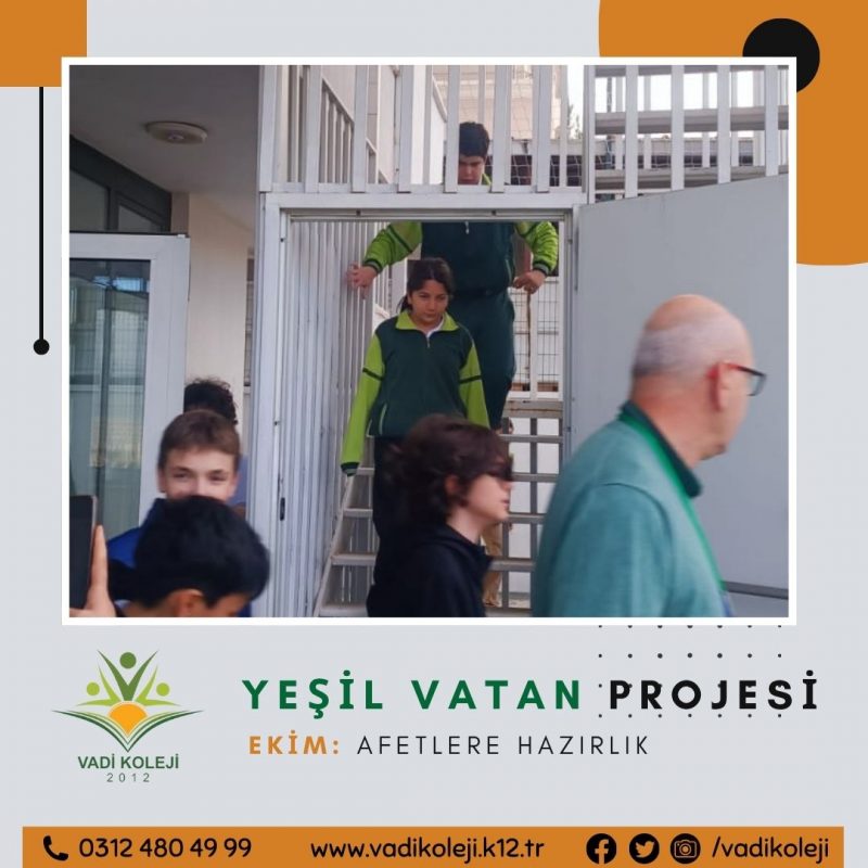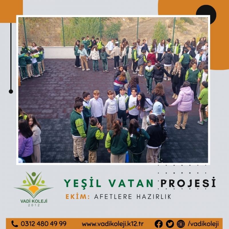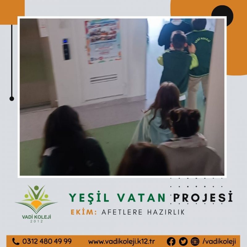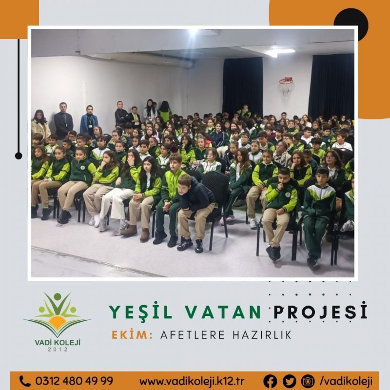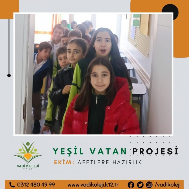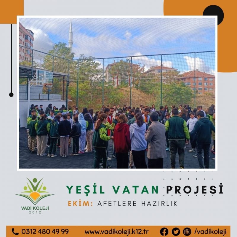 Yeşil Vatan:Benim Okulum Geleceğe Çare projesi kapsamında, Ekim ayının teması afetlere yönelik olarak okulumuzda öğrencilerimize afetlere hazırlık eğitimi verildi. Ardından eş zamanlı deprem tatbikatı uygulandı. Çocuklarımızı ve velilerimizi bililinçlendirmek amacıyla bu ayki panomuzun içeriğini afetlere yönelik eğitici afişler oluşturuyor.